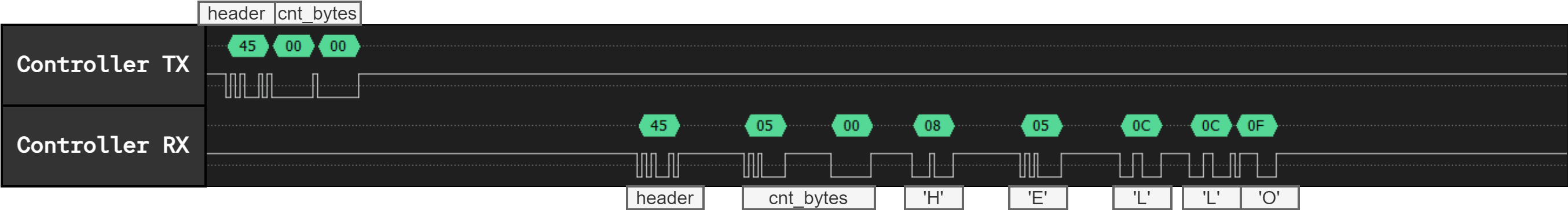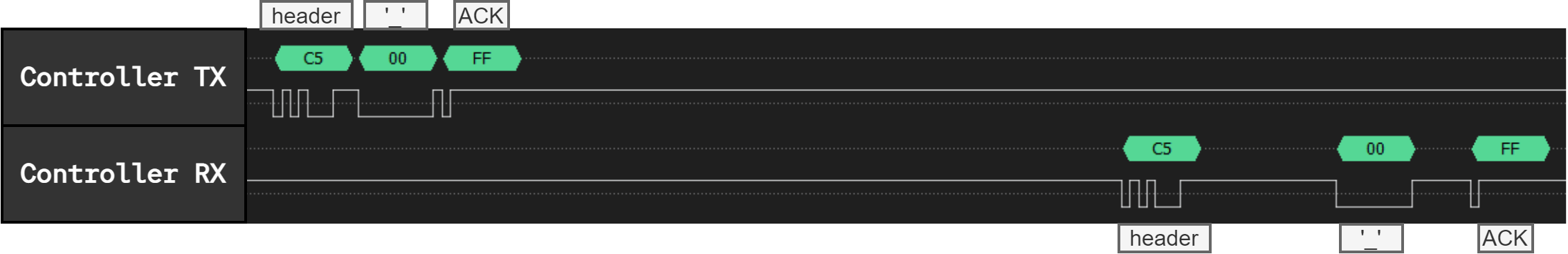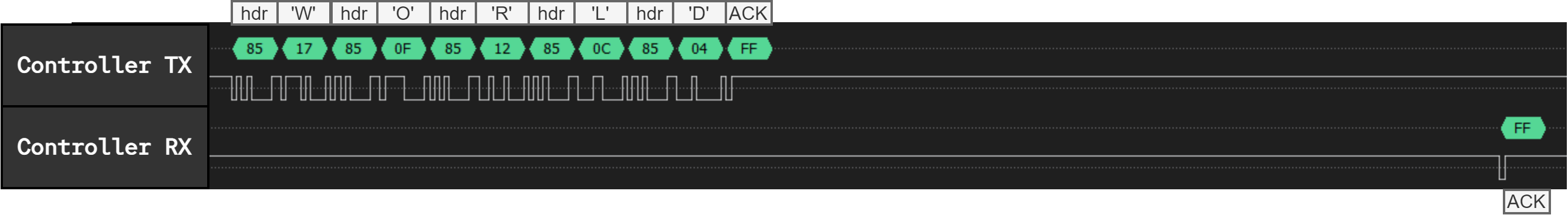 We see the header, followed by the data, followed by the ACK byte transmitted by the controller. The exact same data passes through all modules and is received by the controller.