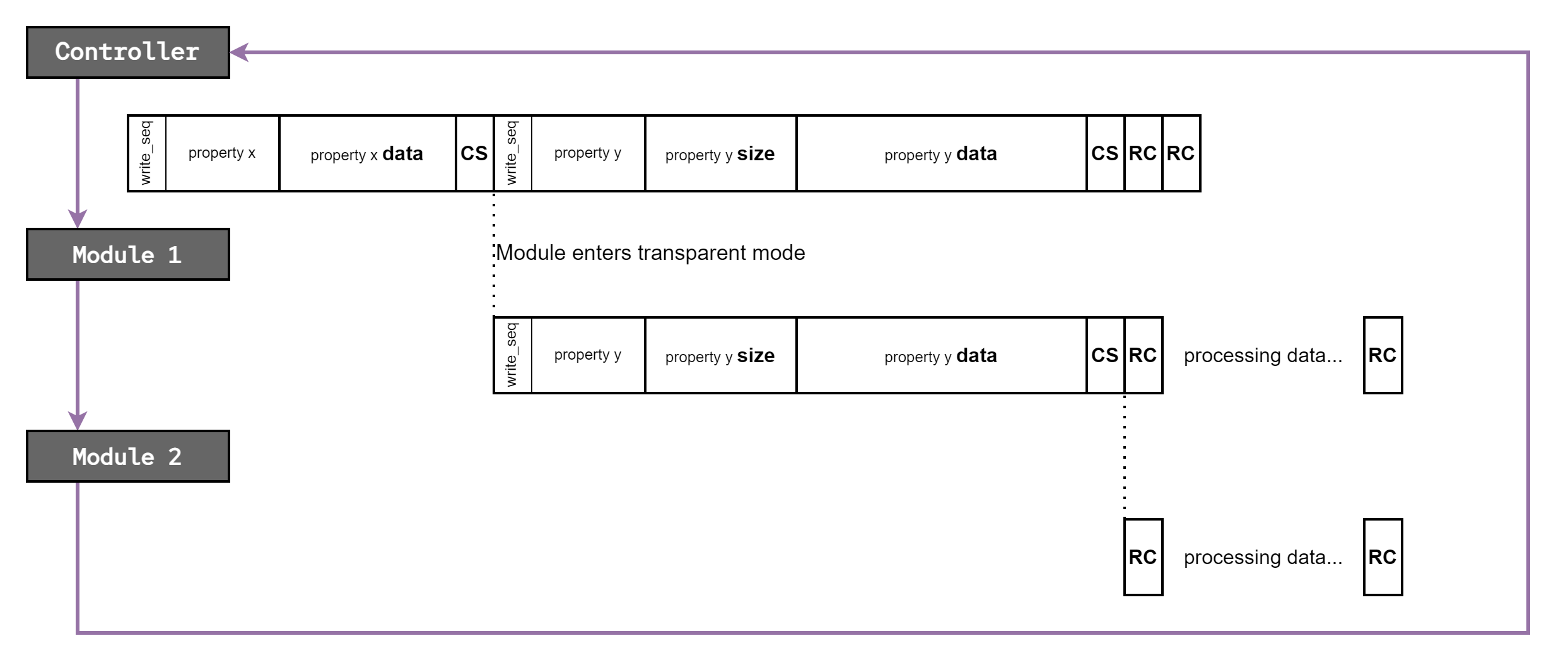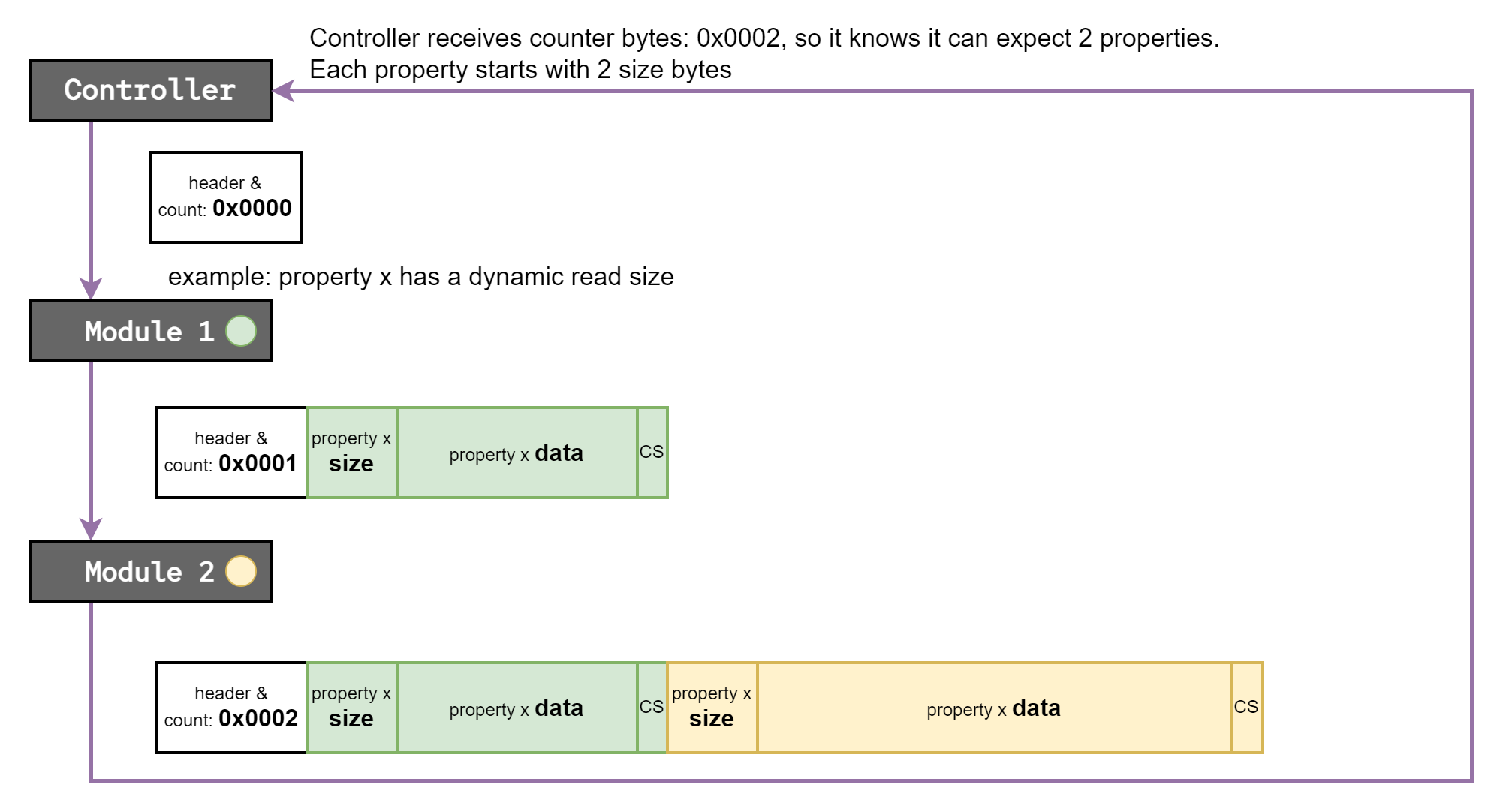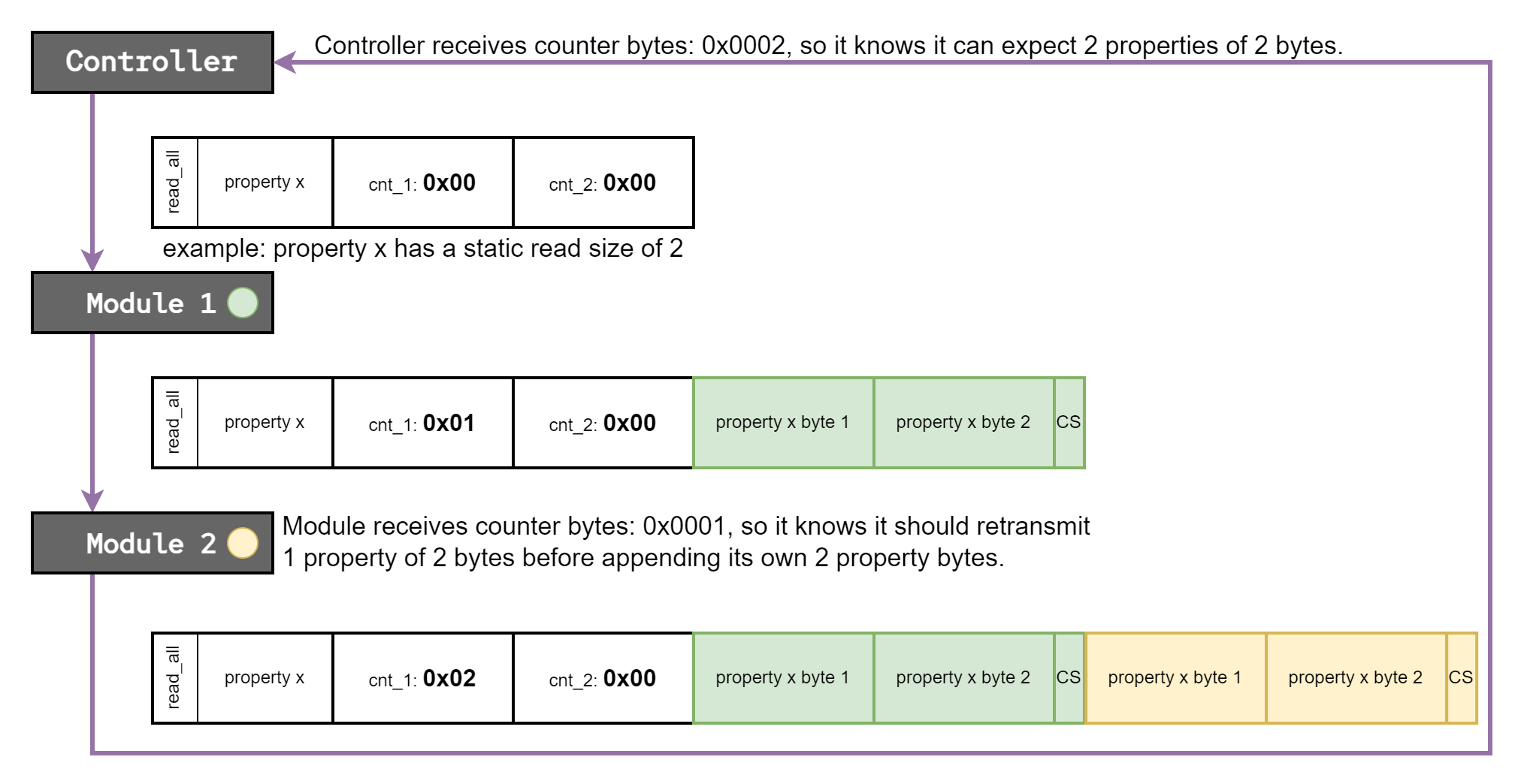 followed by two counting bytes. Each module will retransmit the header, the counting bytes will be retransmitted as well, but each module will increment the counting bytes by one. Next, the module will transmit the property data, followed by a checksum. Sequential modules will know how much data from previous modules to retransmit based of the counting bytes. The last module will retransmit to the controller, which can use the counting bytes to figure out how many modules are in the chain.