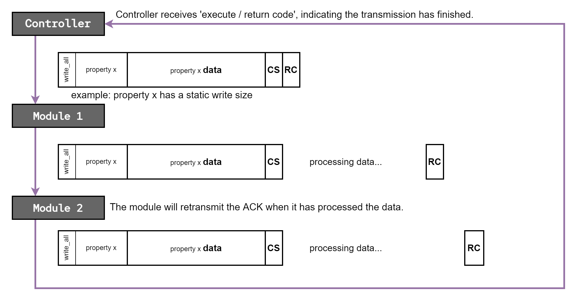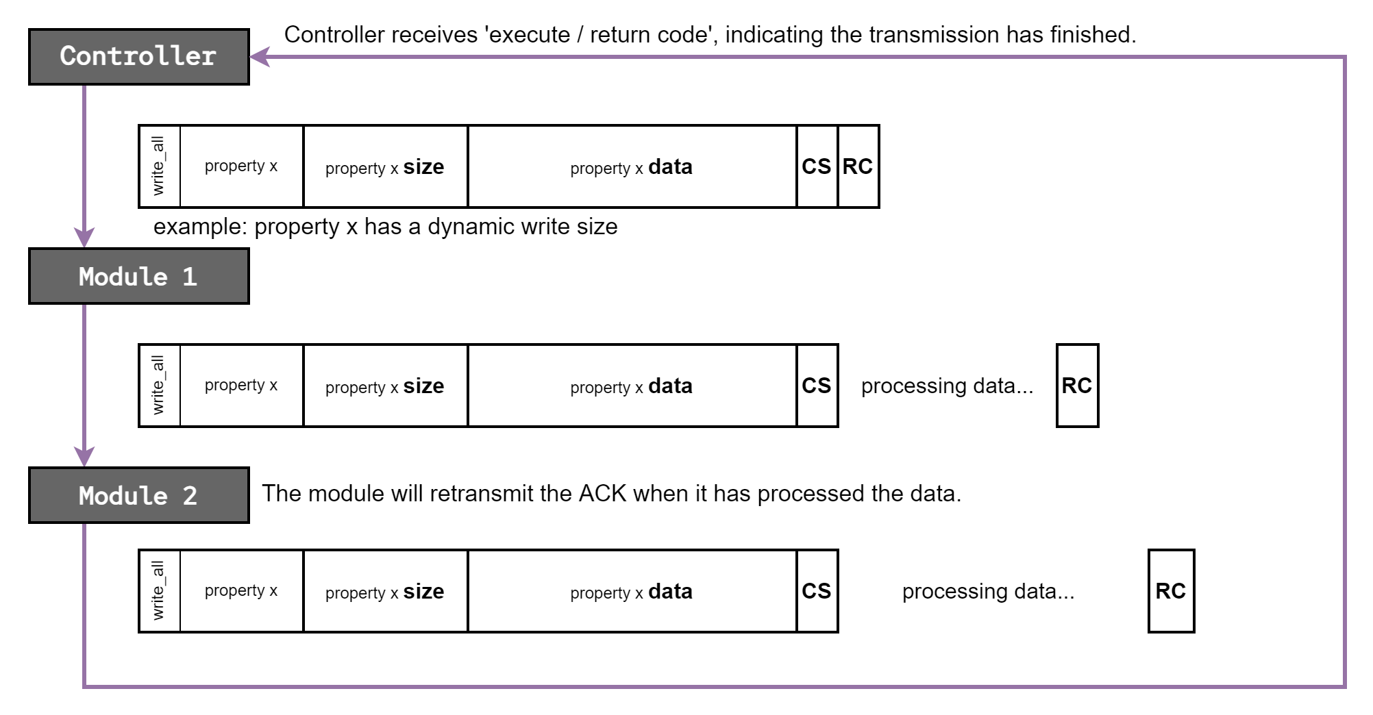 header and the property data. Once a module has retransmitted the property data, and determined the checksum to be valid, it will process the data and wait for the execute / return code