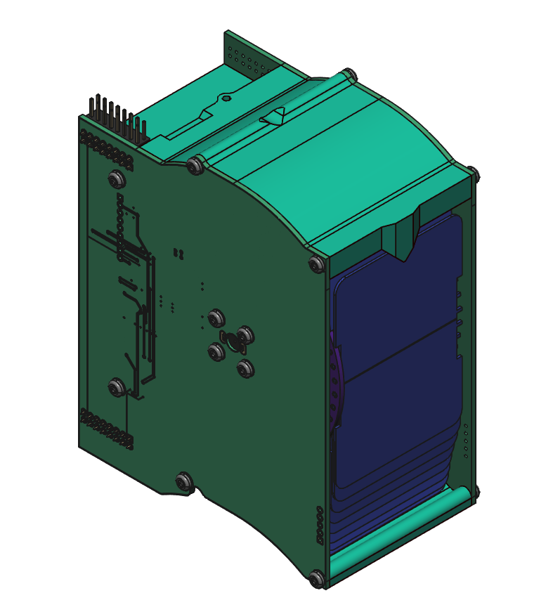 Two side panels make up the main structure of the module. The left side panel is populated with components and the right side panel is left unpopulated. The side panel PCB is responsible for the following tasks: