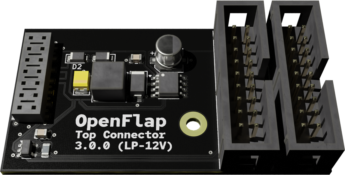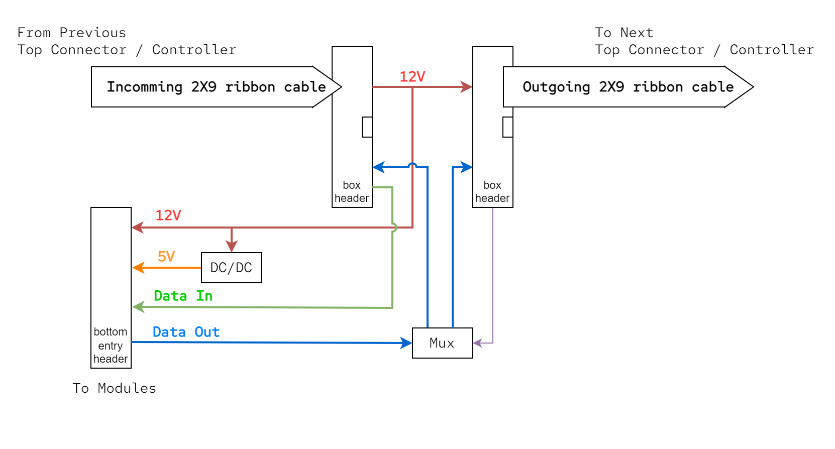 As the name suggests, the Top Connector is placed at the top of each column of modules. The Top Connector routes power and communication signals to the modules in the column. Top Connectors can be connected together using 2x9 IDC ribbon cables, Allowing the display to be daisy chained to any* width.